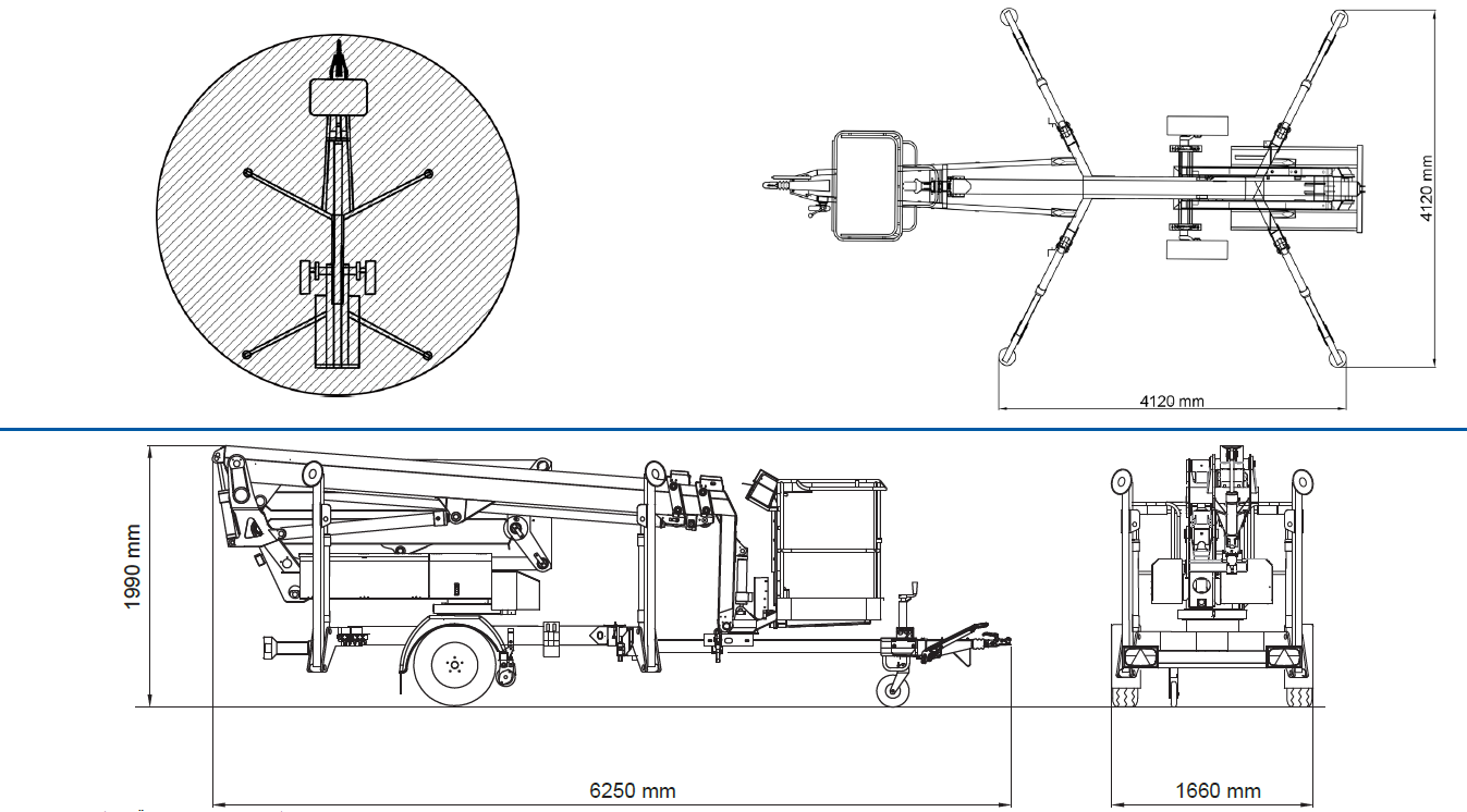 Transportmaße: Länge 6,25 m, Breite 1,66 m, Höhe 1,99 m – kompakt und leicht manövrierbar